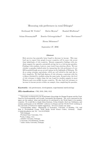 Vieider, F. M., Beyene, A., Bluffstone, R., Dissanayake, S., Gebreegziabher, Z., Martinsson, P. and Mekonnen, A. (2018) Measuring risk preferences in rural Ethiopia. Economic Development and Cultural Change, 66 (3). pp. 417-446. ISSN 1539-2988 doi: 10.1086/696106