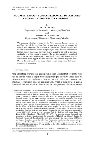Bryan, M. and Longhi, S. orcid id iconORCID: https://orcid.org/0000-0003-4115-3321 (2018) Couples' labour supply responses to job loss: growth and recession compared. The Manchester School, 86 (3). pp. 333-357. ISSN 1467-9957 doi: 10.1111/manc.12186
