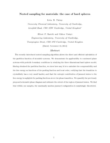 Partay, L. B., Bartok, A. P. and Csanyi, G. (2014) Nested sampling for materials: the case of hard spheres. Physical Review E, 89. 022302. ISSN 1539-3755 doi: 10.1103/PhysRevE.89.022302