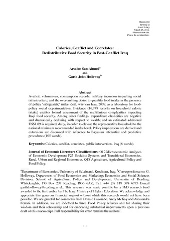 SanAhmed, A. and Holloway, G. orcid id iconORCID: https://orcid.org/0000-0002-2058-4504 (2017) Calories conflict and correlates: redistributive food policy in post-conflict Iraq. Food Policy, 68. pp. 89-99. ISSN 0306-9192 doi: 10.1016/j.foodpol.2017.01.005