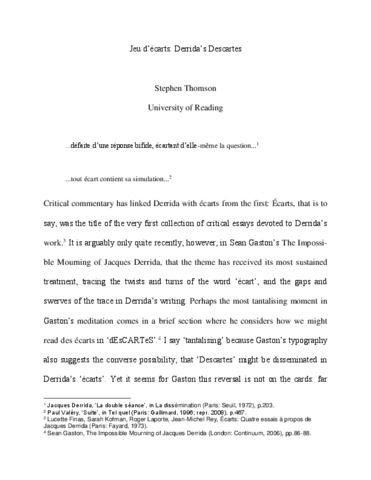Thomson, S. orcid id iconORCID: https://orcid.org/0000-0003-2698-3458 (2017) Jeu d'écarts: Derrida's Descartes. Oxford Literary Review, 39 (2). pp. 189-209. ISSN 0305-1498 doi: 10.3366/olr.2017.0221