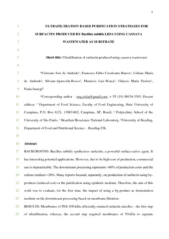 De Andrade, C. J., Barros, F. F. C., De Andrade, L. M., Roco, S. A., Sforca, M. L., Pastore, G. M. and Jauregi, P. (2016) Ultrafiltration based purification strategies for surfactin produced by bacillus subtilis lb5a using cassava wastewater as substrate. Journal of Chemical Technology and Biotechnology, 91 (12). pp. 3018-3027. ISSN 1097-4660 doi: 10.1002/jctb.4928