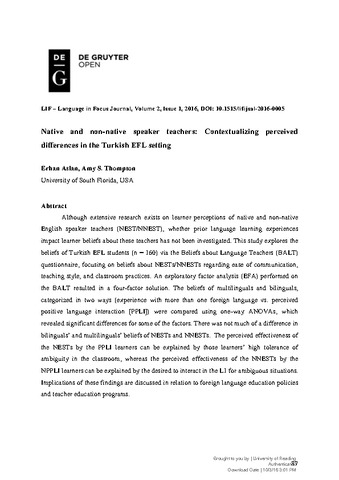 Native and non-native speaker teachers: contextualizing perceived differences in the Turkish EFL setting.