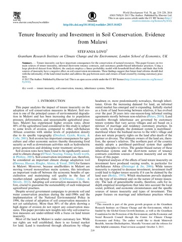 Lovo, S. orcid id iconORCID: https://orcid.org/0000-0001-6231-4142 (2016) Tenure insecurity and investment in soil conservation: evidence from Malawi. World Development, 78. pp. 219-229. ISSN 0305-750X doi: 10.1016/j.worlddev.2015.10.023