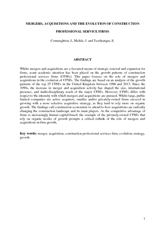 Connaughton, J. orcid id iconORCID: https://orcid.org/0000-0002-8878-8589, Meikle, J. and Teerikangas, S. (2015) Mergers, acquisitions and the evolution of construction professional services firm. Construction Management and Economics, 33 (2). pp. 146-159. ISSN 0144-6193 doi: 10.1080/01446193.2015.1037325