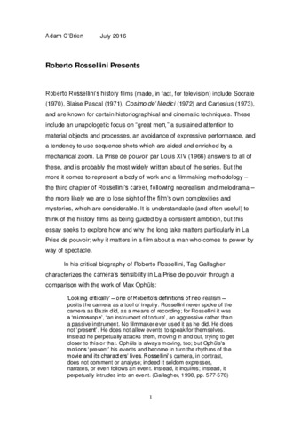 The history films of Roberto Rossellini are often understood as a generally consistent aesthetic and political project, of which the long take forms a part. This chapter instead closely examines La Prise de pouvoir par Louis XIV (1966) as a film in which the long take accrues a particularly intense and complex set of meanings, based on the specific historical subject matter. Drawing on notions of absorption and theatricality introduced by Michael Fried, O’Brien argues that the court setting of Rossellini’s film produces unusual patterns of presentation – an ‘absorption in theatricality’ – which must be accounted for in our interpretations of Rossellini’s style.