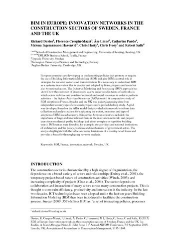 Davies, R., Crespin-Mazet, F., Linne, A., Pardo, C., Havenvid, M. I., Harty, C., Ivory, C. and Salle, R. (2015) BIM in Europe: innovation networks in the construction sectors of Sweden, France and the UK. In: 31st Annual ARCOM Conference, 7-9 September 2015, Lincoln, UK, pp. 1135-1144.