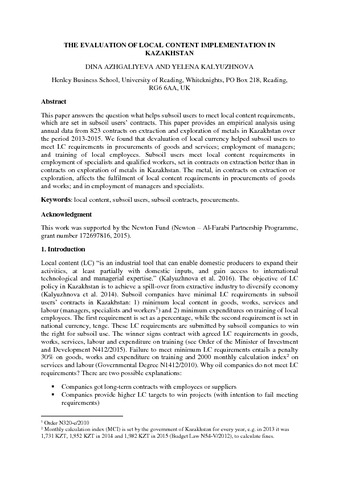 The evaluation of local content implementation in Kazakhstan