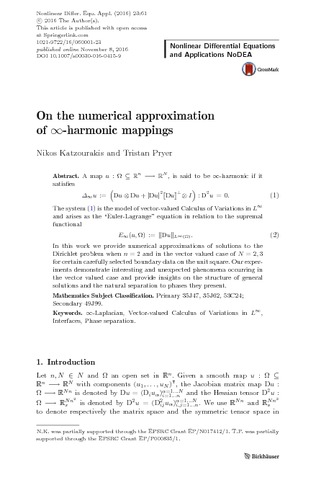 Katzourakis, N. and Pryer, T. (2016) On the numerical approximation of ∞-harmonic mappings. Nonlinear differential equations and applications, 23 (6). 61. ISSN 1420-9004 doi: 10.1007/s00030-016-0415-9