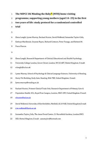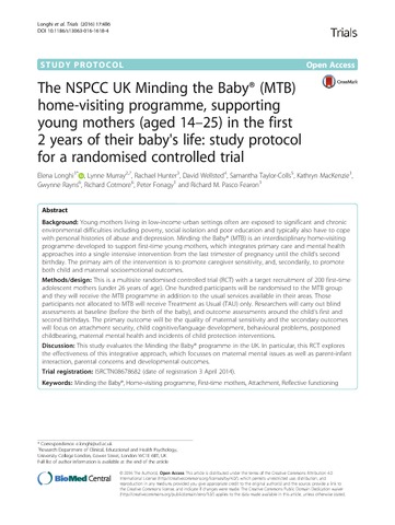 Longhi, E., Murray, L., Hunter, R., Wellsted, D., Taylor-Colls, S., MacKenzie, K., Rayns, G., Cotmore, R., Fonagy, P. and Fearon, P. (2016) The NSPCC UK Minding the Baby® (MTB) home visiting programme, supporting young mothers (aged 14- 25) in the first two years of life: study protocol for a randomized controlled trial. Trials, 17. 486. ISSN 1745-6215 doi: 10.1186/s13063-016-1618-4