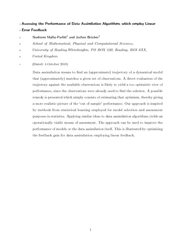 Mallia-Parfitt, N. and Bröcker, J. (2016) Assessing the performance of data assimilation algorithms which employ linear error feedback. Chaos, 26 (10). 103109. ISSN 1089-7682 doi: 10.1063/1.4965029