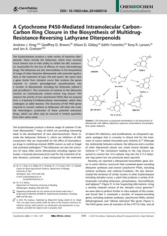 King, A. J., Brown, G. D., Gilday, A. D., Forestier, E., Larson, T. R. and Graham, I. A. (2016) A cytochrome P450-mediated intramolecular carbon-carbon ring closure in the biosynthesis of multidrug-resistance-reversing lathyrane diterpenoids. ChemBioChem, 17 (17). pp. 1593-1597. ISSN 1439-7633 doi: 10.1002/cbic.201600316