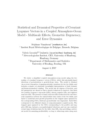 Statistical and dynamical properties of covariant lyapunov vectors in a coupled atmosphere-ocean model—multiscale effects, geometric degeneracy, and error dynamics.