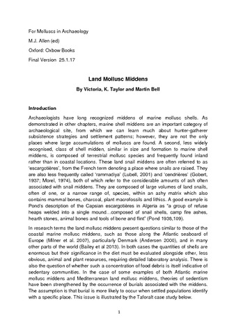 Taylor, V. K. and Bell, M. (2017) Land mollusc middens. In: Allen, M. J. (ed.) Molluscs in Archaeology. Studying Scientific Archaeology (3). Oxbow, Oxford, pp. 195-212. ISBN 9781785706080