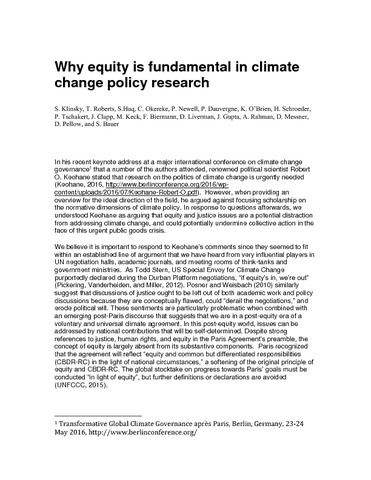 Klinsky, S., Roberts, T., Huq, S., Okereke, C., Newell, P., Dauvergne, P., O'Brien, K., Schroder, H., Tschakert, P., Clapp, J., Keck, M., Biermann, F., Liverman, D., Gupta, J., Rahman, A., Messner, D., Pellow, D. and Bauer, S. (2017) Why equity is fundamental in climate change policy research. Global Environmental Change, 44. pp. 170-173. ISSN 0959-3780 doi: 10.1016/j.gloenvcha.2016.08.002