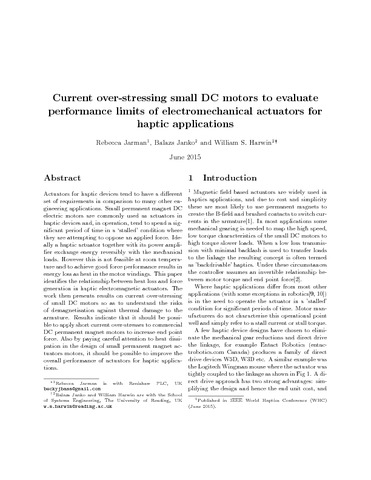 Jarman, R., Janko, B. and Harwin, W. S. orcid id iconORCID: https://orcid.org/0000-0002-3928-3381 (2015) Current over-stressing small DC motors to evaluate performance limits of electromechanical actuators for haptic applications. In: IEEE World Haptics Conference, 22-26 Jun 2015, pp. 171-176. doi: 10.1109/WHC.2015.7177709