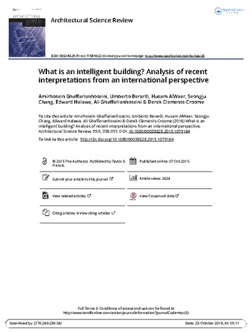 Ghaffarianhoseini, A., Berardi, U., AlWaer, H., Chang, S., Halawa, E., Ghaffarianhoseini, A. and Clements-Croome, D. (2016) What is an intelligent building? Analysis of recent interpretations from an international perspective. Architectural Science Review, 59 (5). pp. 238-257. ISSN 0003-8628 doi: 10.1080/00038628.2015.1079164