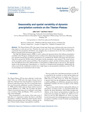 Curio, J. and Scherer, D. (2016) Seasonality and spatial variability of dynamic precipitation controls on the Tibetan Plateau. Earth System Dynamics, 7 (3). pp. 767-782. ISSN 2190-4987 doi: 10.5194/esd-7-767-2016