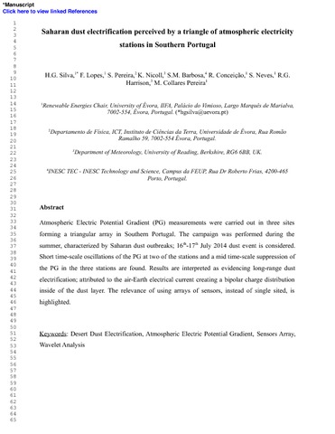 Sliva, H. G., Lopes, F. M., Pereira, S., Nicoll, K. orcid id iconORCID: https://orcid.org/0000-0001-5580-6325, Barbosa, S. M., Conceicao, R., Neves, S., Harrison, R. G. orcid id iconORCID: https://orcid.org/0000-0003-0693-347X and Collares Pereira, M. (2016) Saharan dust electrification perceived by a triangle of atmospheric electricity stations in Southern Portugal. Journal of Electrostatics, 84. pp. 106-120. ISSN 0304-3886 doi: 10.1016/j.elstat.2016.10.002