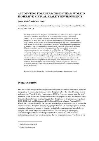 The study examines how designers account for the use and users of their design in the situation of reviewing the design in an Immersive Virtual Reality Environment (IVRE). The focus is on the interactions whereby designers express the imagined perspective of being users, and on how the design meeting is configured with respect to the concern around the use of the future building by the real users. Observations are made around how designers express these ‘narratives’ around experiencing a design as imaginary users through various modes (verbal, graphical, behavioural) involving different procedures and forms of representation. The case study is an on-going construction project for a new hospital in the UK, where an IVRE was used performing design review sessions during the bid preparation stage. Drawing on data based on direct observation and audio-video recordings of multiple design meetings, the scrutiny is on how architects adopt the position of end- users in design sessions in which users do not participate. The aim is to examine the nature and dynamics of interactions inside a design team as they imagine users’ needs in an IVRE. The focus is on how architects express and test the ‘usage’ of their design in this particular technological setting, where life- like movements and physical interactions with the design are possible.