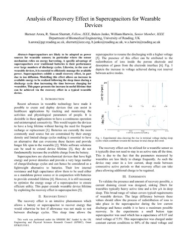 Arora, H., Sherratt, R. S. orcid id iconORCID: https://orcid.org/0000-0001-7899-4445, Janko, B. and Harwin, W. orcid id iconORCID: https://orcid.org/0000-0002-3928-3381 (2017) Analysis of recovery effect in supercapacitors for wearable devices. In: IEEE International Conference on Consumer Electronics, 8-10 Jan 2017, Las Vegas, USA. doi: 10.1109/ICCE.2017.7889322