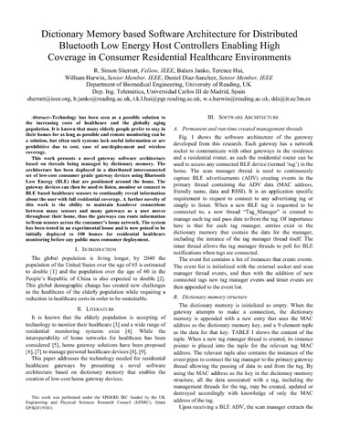 Sherratt, R. S. orcid id iconORCID: https://orcid.org/0000-0001-7899-4445, Janko, B., Hui, T., Harwin, W. orcid id iconORCID: https://orcid.org/0000-0002-3928-3381 and Diaz-Sanchez, D. (2017) Dictionary memory based software architecture for distributed bluetooth low energy host controllers enabling high coverage in consumer residential healthcare environments. In: IEEE International Conference on Consumer Electronics, 8-10 Jan 2017, Las Vegas, USA. doi: 10.1109/ICCE.2017.7889373