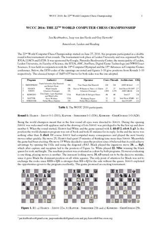 Krabbenbos, J., van den Herik, J. and Haworth, G. orcid id iconORCID: https://orcid.org/0000-0001-9896-1448 (2017) WCCC 2016: the 22nd World Computer Chess Championship. ICGA Journal, 39 (1). pp. 47-59. ISSN 1389-6911 doi: 10.3233/ICG-170014