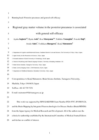 Sugiura, A., Aoki, R., Murayama, K., Yomogida, Y., Haji, T., Saito, A., Hasegawa, T. and Matsumoto, K. (2016) Regional gray matter volume in the posterior precuneus is associated with general self-efficacy. Neuroreport, 27 (18). pp. 1350-1353. ISSN 1473-558X doi: 10.1097/WNR.0000000000000702