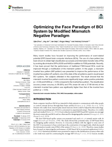 Zhou, S., Jin, J., Daly, I., Wang, X. and Cichocki, A. (2016) Optimizing the face paradigm of BCI system by modified mismatch negative paradigm. Frontiers in Neuroscience, 10. 444. ISSN 1662-453X doi: 10.3389/fnins.2016.00444