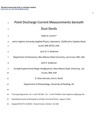 Lorenz, R. D., Neakrase, L. D. V., Anderson, J. P., Harrison, R. G. orcid id iconORCID: https://orcid.org/0000-0003-0693-347X and Nicoll, K. A. orcid id iconORCID: https://orcid.org/0000-0001-5580-6325 (2016) Point discharge current measurements beneath dust devils. Journal of Atmospheric and Solar-Terrestrial Physics, 150-151. pp. 55-60. ISSN 1364-6826 doi: 10.1016/j.jastp.2016.10.017
