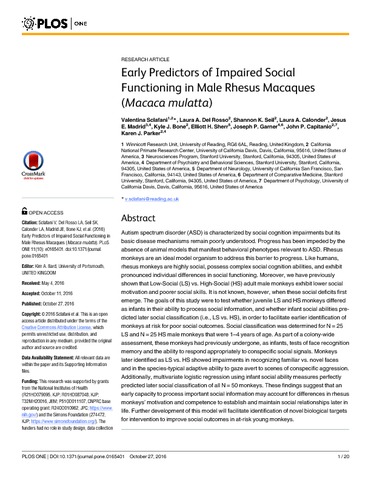 Sclafani, V., Del Rosso, L. A., Seil, S. K., Calonder, L. A., Madrid, J. E., Bone, K. J., Sherr, E. H., Garner, J. P., Capitanio, J. P. and Parker, K. J. (2016) Early predictors of impaired social functioning in male rhesus macaques (Macaca mulatta). PLoS ONE, 11 (10). e0165401. ISSN 1932-6203 doi: 10.1371/journal.pone.0165401