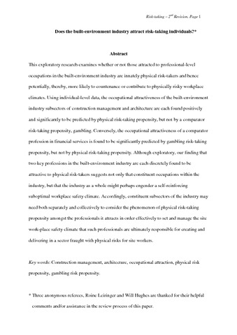 This exploratory research examines whether or not those attracted to professional-level occupations in the built-environment industry are innately physical risk-takers and hence potentially, thereby, more likely to countenance or contribute to physically risky workplace climates. Using individual-level data, the occupational attractiveness of the built-environment industry subsectors of construction management and architecture are each found positively and significantly to be predicted by physical risk-taking propensity, but not by a comparator risk-taking propensity, gambling. Conversely, the occupational attractiveness of a comparator profession in financial services is found to be significantly predicted by gambling risk-taking propensity, but not by physical risk-taking propensity. Although exploratory, our finding that two key professions in the built-environment industry are each discretely found to be attractive to physical risk-takers suggests not only that constituent occupations within the industry, but that the industry as a whole might perhaps engender a self-reinforcing suboptimal workplace safety climate. Accordingly, constituent subsectors of the industry may need both separately and collectively to consider the phenomenon of physical risk-taking propensity amongst the professionals it attracts in order effectively to set and manage the site work-place safety climate that such professionals are ultimately responsible for creating and delivering in a sector fraught with physical risks for site workers.