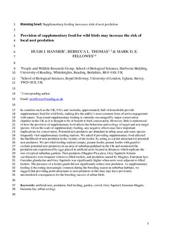 Hanmer, H. J., Thomas, R. L. and Fellowes, M. D. E. orcid id iconORCID: https://orcid.org/0000-0001-5431-8637 (2017) Provision of supplementary food for wild birds may increase the risk of local nest predation. Ibis, 159 (1). pp. 158-167. ISSN 0019-1019 doi: 10.1111/ibi.12432
