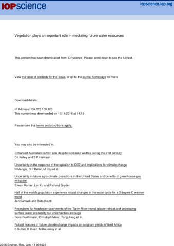 Ukkola, A. M., Keenan, T. F., Kelley, D. I. and Prentice, I. C. (2016) Vegetation plays an important role in mediating future water resources. Environmental Research Letters, 11 (9). 094022. ISSN 1748-9326 doi: 10.1088/1748-9326/11/9/094022