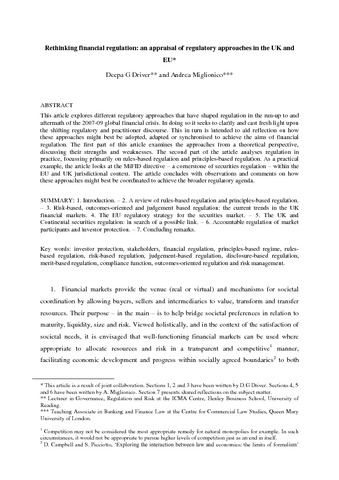 Rethinking financial regulation: an appraisal of regulatory approaches in the UK and EU.