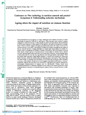Immunosenescence during ageing is a major challenge which weakens the ability of older individuals to respond to infection or vaccination. There has been much interest in dietary strategies to improve immunity in older people, but there is an assumption that modulation of the immune response in older people will be based on the same principles as for younger adults. Recent evidence suggests that ageing fundamentally alters the impact of nutrition on immune function. As a result, interpretation of data from studies investigating the impact of diet on immune function is highly dependent on subject age. Study design is critically important when investigating the efficacy of dietary components, and most studies involving older people include rigorous inclusion/exclusion criteria based on medical history, laboratory tests, general health status and often nutritional status. However, immunological status is rarely accounted for, but can vary significantly, even amongst healthy older people. There are several clear examples of age-related changes in immune cell composition, phenotype and/or function, which can directly alter the outcome of an intervention. This review uses two case studies to illustrate how the effects of n-3 PUFA and probiotics differ markedly in young v. older subjects. Evidence from both suggests that baseline differences in immunosenescence influence the outcome of an intervention, highlighting the need for detailed immunological characterisation of subjects prior to interventions. Finally, future work elucidating alterations in metabolic regulation within cells of the immune system as a result of ageing may be important in understanding the impact of diet on immune function in older people.