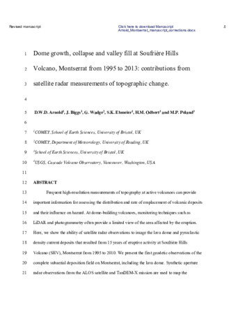 Arnold, D. W. D., Biggs, J., Wadge, G., Ebmeier, S. K., Odbert, H. M. and Poland, M. P. (2016) Dome growth, collapse, and valley fill at Soufrière Hills Volcano, Montserrat, from 1995 to 2013: Contributions from satellite radar measurements of topographic change. Geosphere, 12 (4). pp. 1300-1315. ISSN 1553-040X doi: 10.1130/GES01291.1