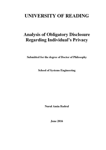 Badrul, N. A. B. (2016) Analysis of obligatory disclosure regarding individual’s privacy. PhD thesis, University of Reading.