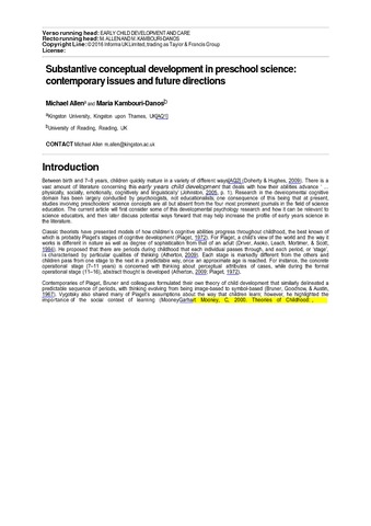 Allen, M. and Kambouri-Danos, M. orcid id iconORCID: https://orcid.org/0000-0001-5591-9418 (2017) Substantive conceptual development in preschool science: contemporary issues and future directions. Early Child Development and Care, 187 (2). pp. 181-191. ISSN 1476-8275 doi: 10.1080/03004430.2016.1237561