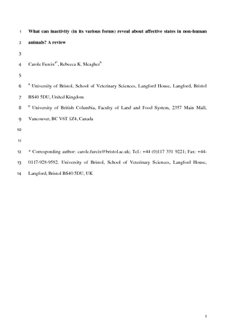 Fureix, C. and Meagher, R. K. (2015) What can inactivity (in its various forms) reveal about affective states in non-human animals? A review. Applied Animal Behaviour Science, 171. pp. 8-24. ISSN 0168-1591 doi: 10.1016/j.applanim.2015.08.036
