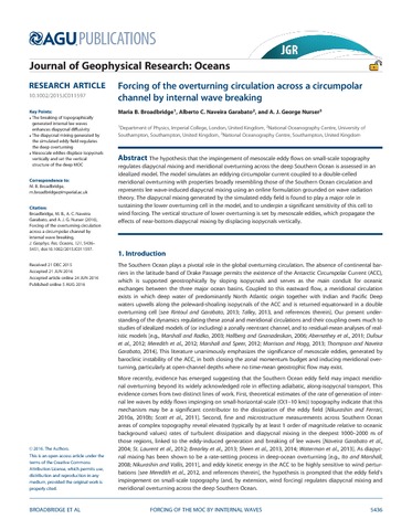 Broadbridge, M. B., Naveira Garabato, A. C. and Nurser, A. J. G. (2016) Forcing of the overturning circulation across a circumpolar channel by internal wave breaking. Journal of Geophysical Research: Oceans, 121 (8). pp. 5436-5451. ISSN 2169-9291 doi: 10.1002/2015JC011597