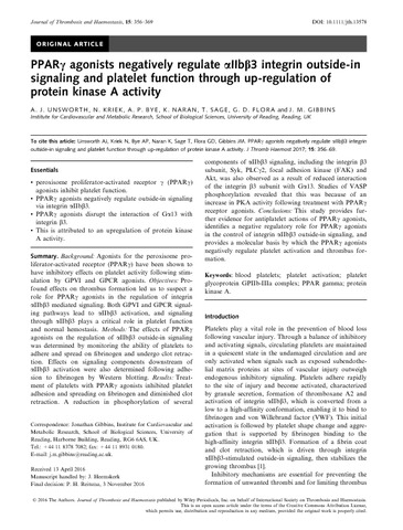 Unsworth, A. J., Kriek, N., Bye, A. P. orcid id iconORCID: https://orcid.org/0000-0002-2061-2253, Naran, K., Sage, T., Flora, G. D. and Gibbins, J. M. orcid id iconORCID: https://orcid.org/0000-0002-0372-5352 (2017) PPARγ agonists negatively regulate αIIbβ3 integrin outside-in signalling and platelet function through upregulation of protein kinase A activity. Journal of Thrombosis and Haemostasis, 15 (2). pp. 356-369. ISSN 1538-7933 doi: 10.1111/jth.13578