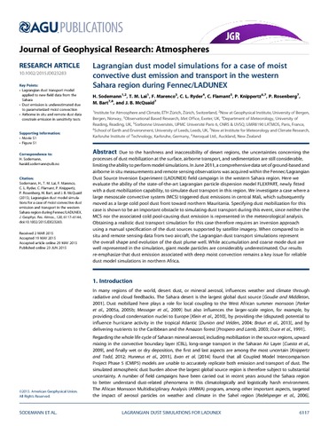 Sodemann, H., Lai, T. M., Marenco, F., Ryder, C. L. orcid id iconORCID: https://orcid.org/0000-0002-9892-6113, Flamant, C., Knippertz, P., Rosenberg, P., Bart, M. and McQuaid, J. B. (2015) Lagrangian dust model simulations for a case of moist convective dust emission and transport in the western Sahara region during Fennec/LADUNEX. Journal of Geophysical Research: Atmospheres, 120 (12). pp. 6117-6144. ISSN 2169-8996 doi: 10.1002/2015JD023283