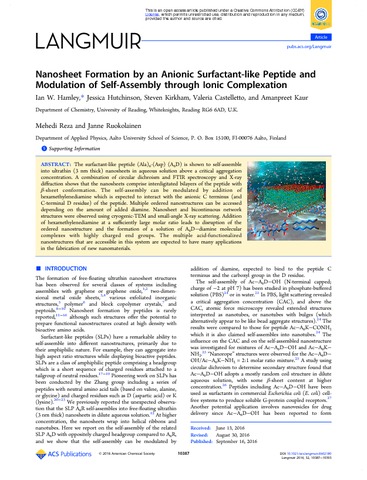 Hamley, I. W. orcid id iconORCID: https://orcid.org/0000-0002-4549-0926, Hutchinson, J., Kirkham, S., Castelletto, V., Kaur, A., Reza, M. and Ruokolainen, J. (2016) Nanosheet formation by an anionic surfactant-like peptide and modulation of self-assembly through ionic complexation. Langmuir, 32 (40). pp. 10387-10393. ISSN 0743-7463 doi: 10.1021/acs.langmuir.6b02180