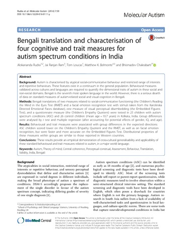 Uncontrolled Keywords Autism Theory of mind Central coherence Perceptual construal Assessment Behaviour Translation Validity India Bengali