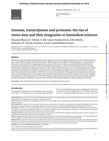 Manzoni, C., Kia, D. A., Vandrovcova, J., Hardy, J., Wood, N. W., Lewis, P. A. and Ferrari, R. (2018) Genome, transcriptome and proteome: the rise of omics data and their integration in biomedical sciences. Briefings In Bioinformatics, 19 (2). pp. 286-302. ISSN 1467-5463 doi: 10.1093/bib/bbw114