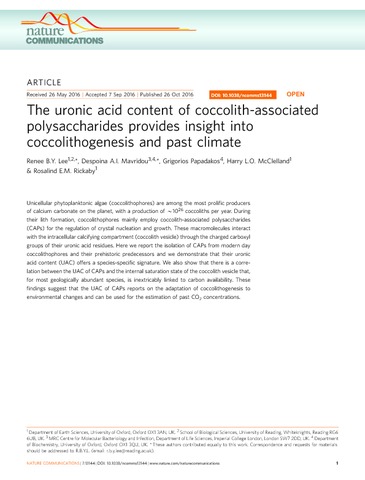Lee, R. B. Y., Mavridou, D. A. I., Papadakos, G., McClelland, H. L. O. and Rickaby, R. E. M. (2016) The uronic acid content of coccolith-associated polysaccharides provides insight into coccolithogenesis and past climate. Nature Communications, 7. 13144. ISSN 2041-1723 doi: 10.1038/ncomms13144