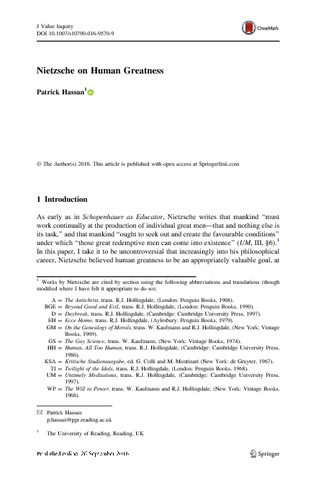 Hassan, P. (2017) Nietzsche on human greatness. Journal of Value Inquiry, 51 (2). pp. 293-310. ISSN 1573-0492 doi: 10.1007/s10790-016-9570-9