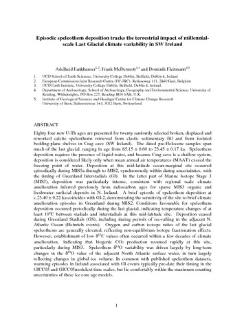 Eighty four new U-Th ages are presented for twenty randomly selected broken, displaced and reworked calcite speleothems retrieved from clastic sedimentary fill and from isolated bedding-plane shelves in Crag cave (SW Ireland). The dated pre-Holocene samples span much of the last glacial, ranging in age from 85.15 ± 0.60 to 23.45 ± 0.17 ka. Speleothem deposition requires the presence of liquid water, and because Crag cave is a shallow system, deposition is considered likely only when mean annual air temperatures (MAAT) exceed the freezing point of water. Deposition at this mid-latitude ocean-marginal site occurred episodically during MIS5a through to MIS2, synchronously within dating uncertainties, with the timing of Greenland Interstadials (GI). In the latter part of Marine Isotope Stage 3 (MIS3), deposition was particularly intense, consistent with regional scale climate amelioration inferred previously from radiocarbon ages for sparse MIS3 organic and freshwater surficial deposits in N. Ireland. A brief episode of speleothem deposition at c.23.40 ± 0.22 ka coincides with GI-2, demonstrating the sensitivity of the site to brief climate amelioration episodes in Greenland during MIS2. Conditions favourable for speleothem deposition occurred periodically during the last glacial, indicating temperature changes of at least 10oC between stadials and interstadials at this mid-latitude site. Deposition ceased during Greenland Stadials (GS), including during periods of ice-rafting in the adjacent N. Atlantic Ocean (Heinrich events). Oxygen and carbon isotope ratios of the last glacial speleothems are generally elevated, reflecting non-equilibrium isotope fractionation effects. However, establishment of low 13C values often occurred within a few decades of climate amelioration, indicating that biogenic CO2 production resumed rapidly at this site, particularly during MIS3. Speleothem 18O variability was driven largely by long-term changes in the 18O value of the adjacent North Atlantic surface water, in turn largely reflecting changes in global ice volume. In common with published speleothem datasets, warming episodes in Ireland associated with GI events typically pre-date their timing in the GICC05 and GICC05modelext time scales, but lie comfortably within the maximum counting uncertainties of these ice core age models.