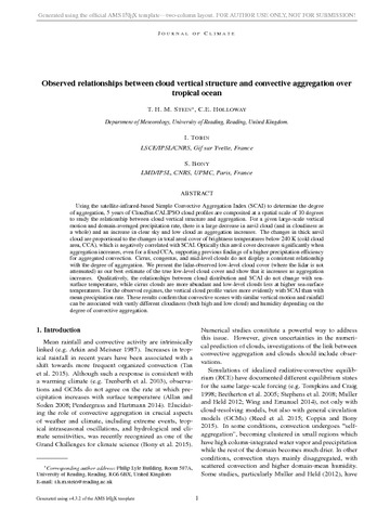 Stein, T. H. M. orcid id iconORCID: https://orcid.org/0000-0002-9215-5397, Holloway, C. E. orcid id iconORCID: https://orcid.org/0000-0001-9903-8989, Tobin, I. and Bony, S. (2017) Observed relationships between cloud vertical structure and convective aggregation over tropical ocean. Journal of Climate, 30 (6). pp. 2187-2207. ISSN 1520-0442 doi: 10.1175/JCLI-D-16-0125.1